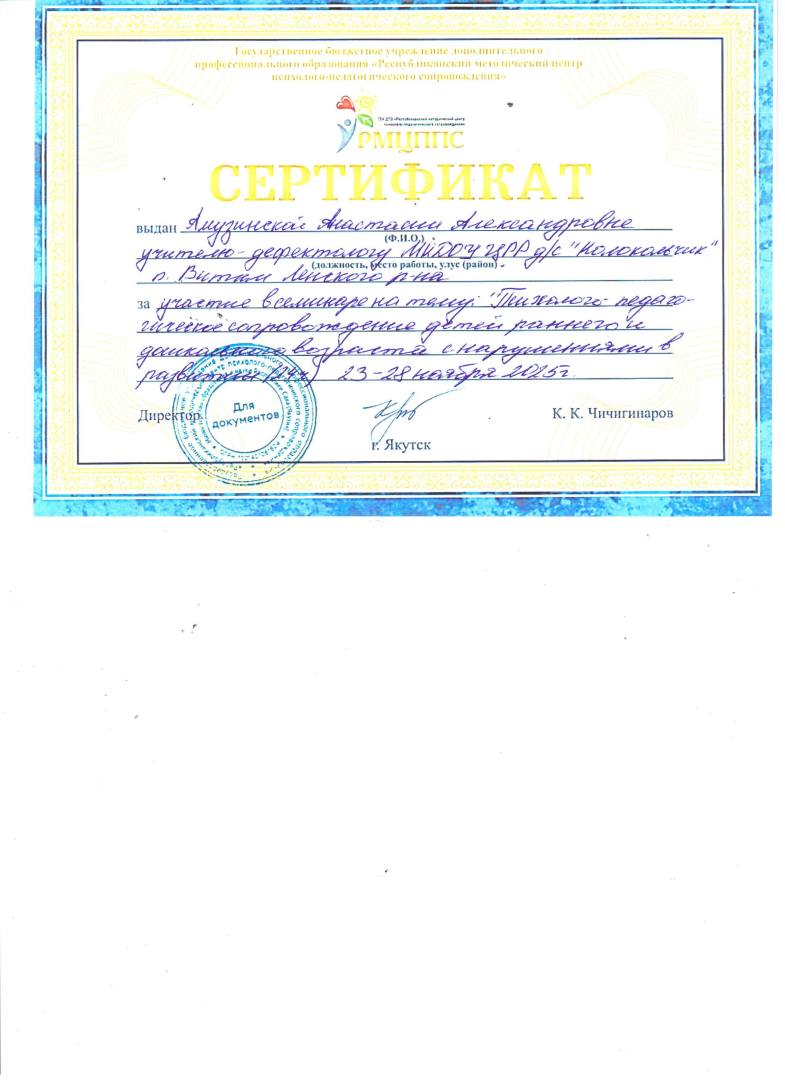 - 2025 г., 72 часа. ООО «Московский институт профессиональной переподготовки и повышения квалификации педагогов» г.Москва. Повышение квалификации по программе «Организация и содержание работы логопеда-дефектолога в условиях реализации ФГОС ДО». (Удостоверение о повышении квалификации №0388644).