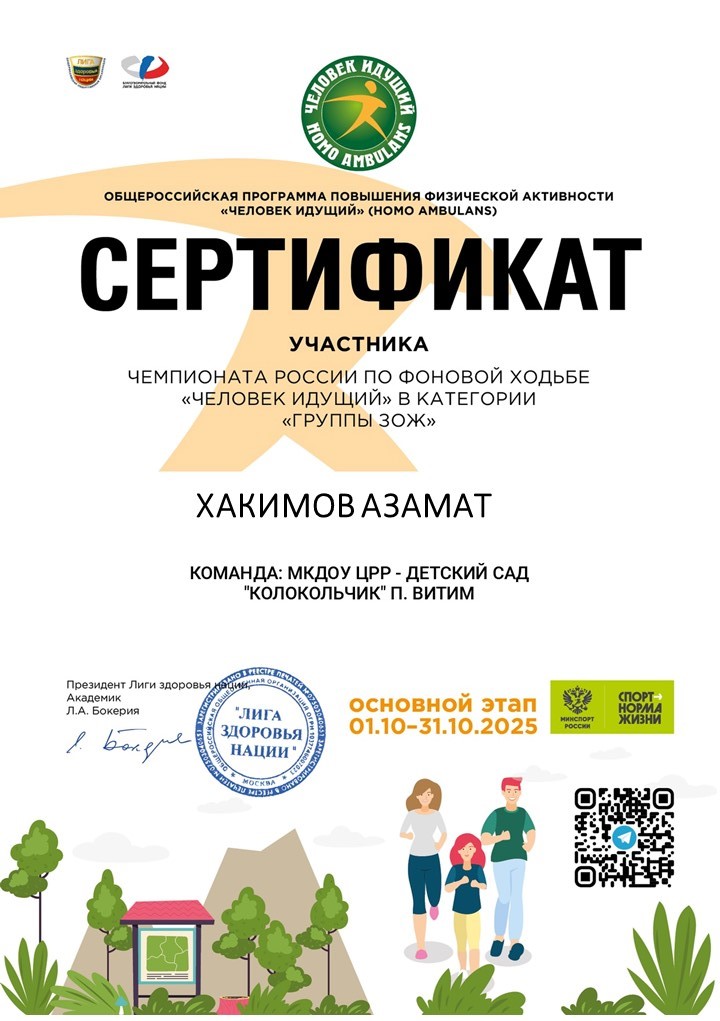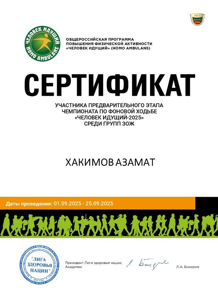 - 2025г. — Сертификат участника Чемпионата России по фоновой ходьбе «Человек идущий» в категории «Группы ЗОЖ», 01.10.2025-31.10.2025г