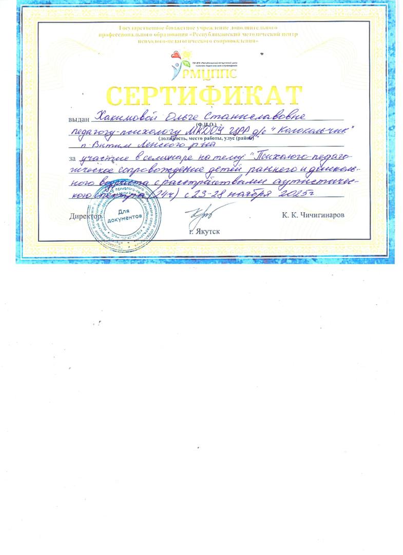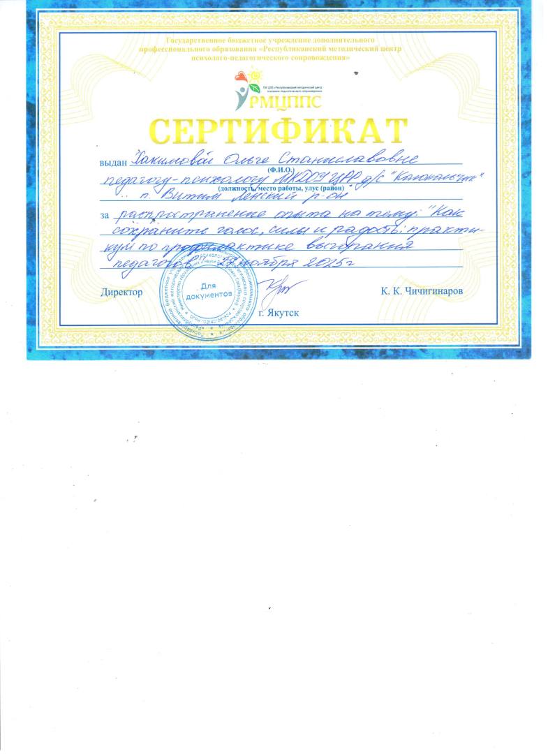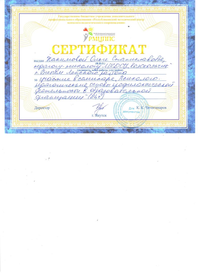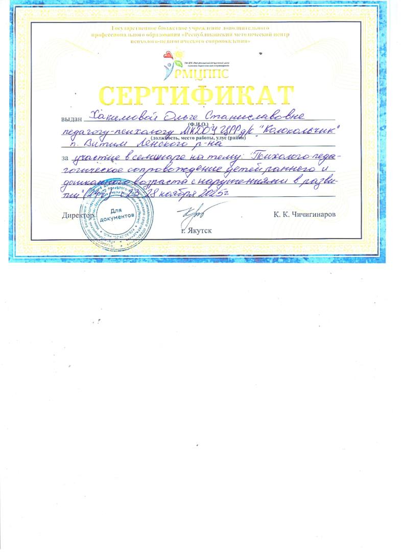 - 2022г., Сертификат об участии в январском совещании педагогических работников — 2022 «Качество образования: методические аспекты». Тема: Секция «Нейропсихологические игры и упражнения с детьми дошкольного и младшего школьного возраста», МинОбрНауки РС(Я) АОУ РС(Я) ДПО «Институт развития образования и повышения квалификации имени С.Н. Донского II, г. Якутск