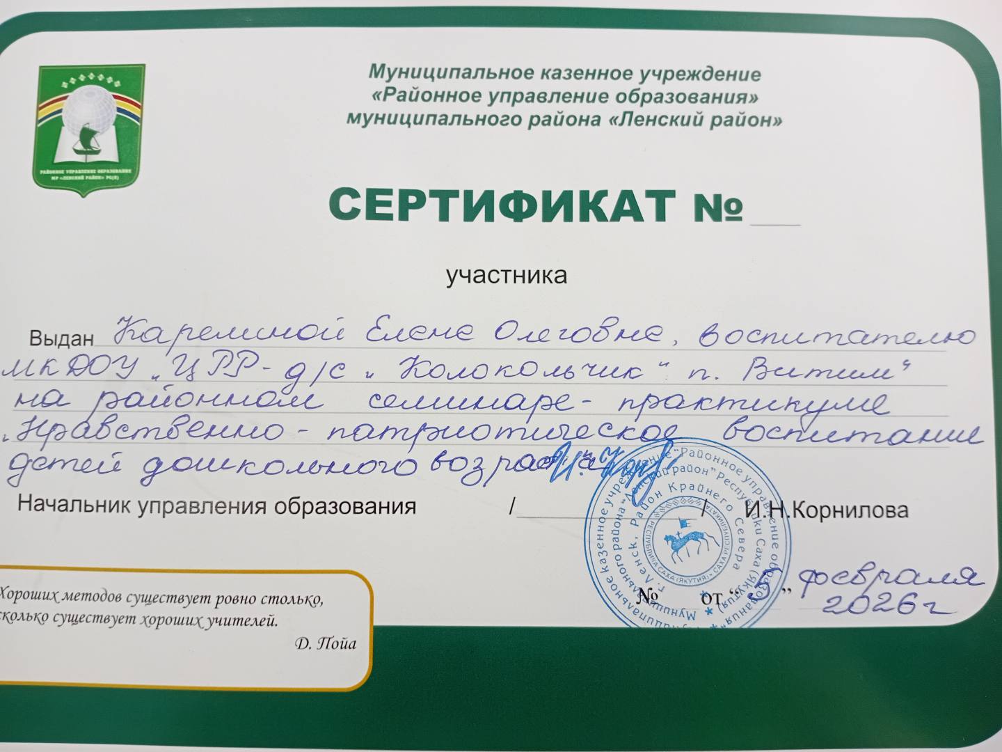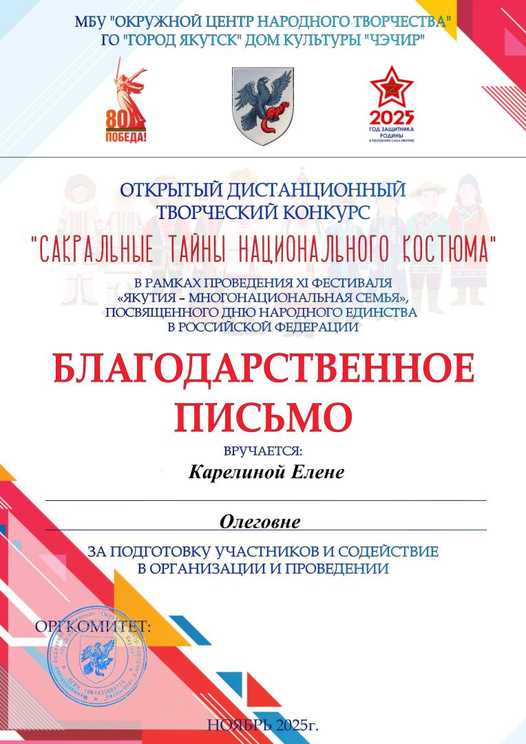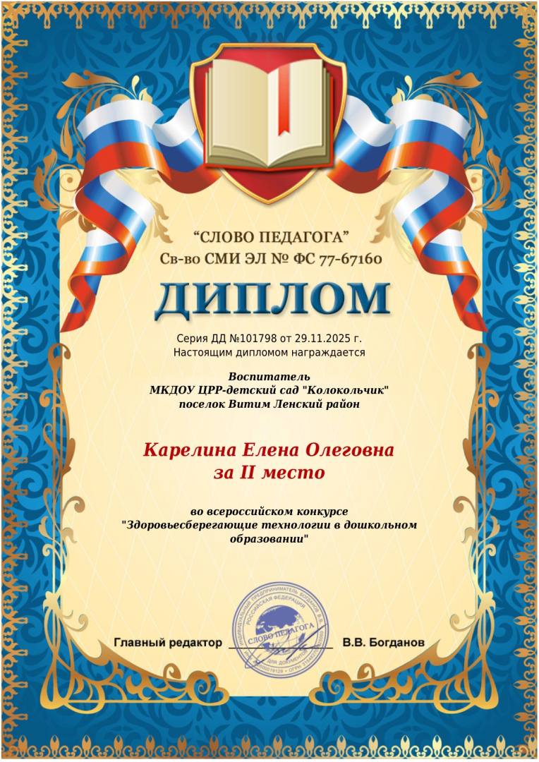 - Справка, дана Карелиной Елене Олеговне, воспитателю МКДОУ «Центр развития ребенка — Детский сад Колокольчик поселка Витим», являющейся гражданской активисткой поселка Витим Ленского района, отработавшей 15-17 марта 2024 года на выборах Президента России общественным наблюдателем.