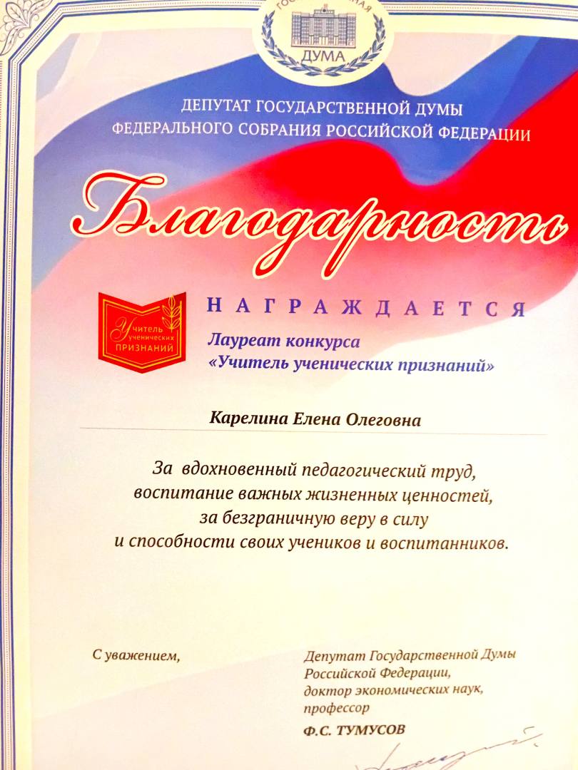 - Благодарность от депутата Государственной Думы Федерального собрания Российской Федерации за вдохновенный педагогический труд, воспитание важных жизненных ценностей, за безграничную веру в силу и способности своих учеников и воспитанников.