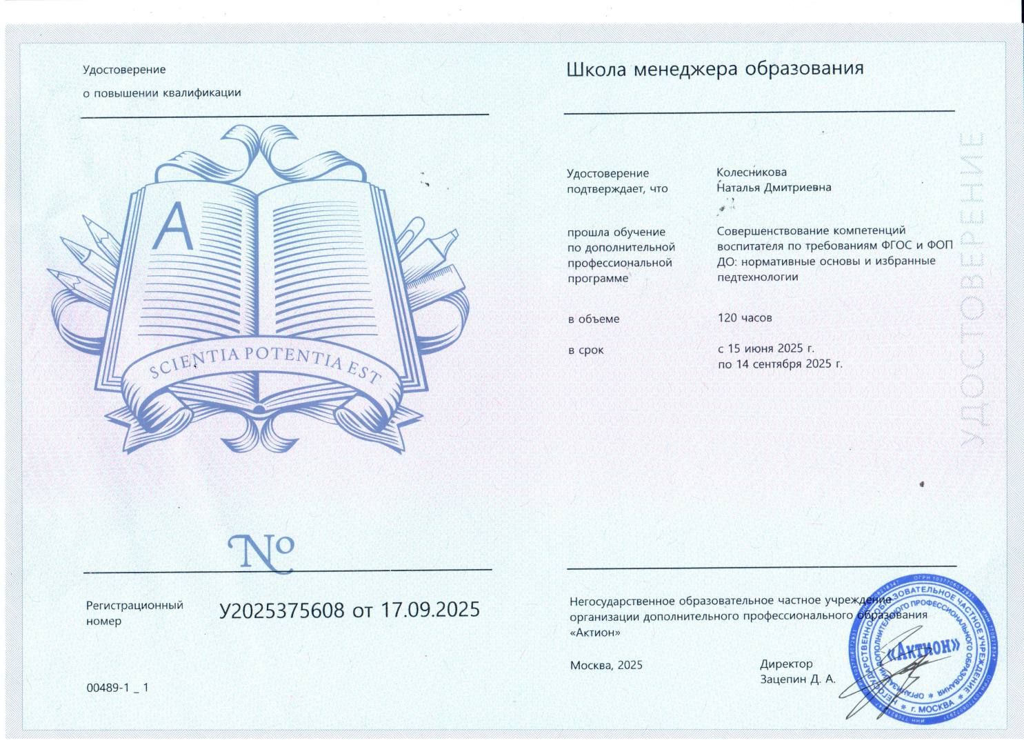 - Негосударственное образовательное частное учреждение организации дополнительного профессионального образования «Актион». Повышение квалификации по программе «Совершенствование компетенций воспитателя по требованиям ФГОС и ФОП ДО: нормативные основы и избранные педтехнологии» Удостоверение № У2025375608 от 17.09.2025 г