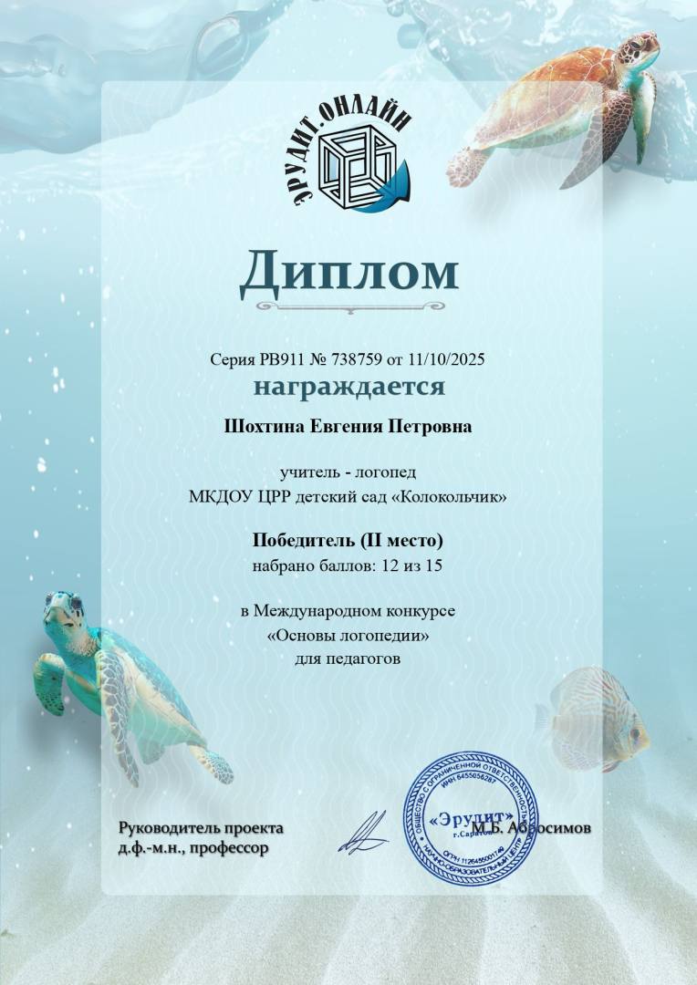 2025 год Сертификат участника Всероссийского конкурса педагогических работников «Методист года России» 2025 Диплом победителя (II место) в Международном конкурсе «Основы логопедии» для педагогов 2023 год Благодарность за подготовку обучающихся к участию во Всероссийской онлайн-олимпиаде «Всезнайкино». 2022 год XXIX Всероссийская олимпиада для детей дошкольного возраста — «ОСНОВЫ БЕЗОПАСНОСТИ» XXIX Всероссийская олимпиада для детей дошкольного возраста — «РЕБУС» Диплом 1 степени Республиканского конкурса видеороликов по правилам дорожного движения «Жизнь без рисков» Благодарственное письмо Республиканского конкурса видеороликов по правилам дорожного движения «Жизнь без рисков» Всероссийский смотр-конкурс «Лучшие детские сады России 2022» (подготовка материалов и представление учреждения на конкурсе) Сертификат участника международного исследования в рамках ЕССЕ-РЕГИОН Онлайн. Дальневосточный федеральный округ. Республика Саха (Якутия), Онлайн «Воспитание дошкольников на основе традиционных духовно-нравственных ценностей народов Российской Федерации» Сертификат участника Научно-практической конференции ЕССЕ-РЕГИОН Онлайн «Воспитание дошкольников на основе традиционных духовно-нравственных ценностей народов РФ». Дальневосточный федеральный округ. Республика Саха (Якутия) Благодарственное письмо за организацию участия и подготовку воспитанников во Всероссийском конкурсе исполнителей литературных и музыкальных произведений, посвящённом Дню матери «Для мамы любимой волшебные строки…» Благодарственное письмо за привлечение к участию воспитанников и педагогов образовательной организации во Всероссийском конкурсе исполнителей литературных и музыкальных произведений, посвящённом Дню матери «Для мамы любимой волшебные строки…» 2021 год Подготовка материалов и представление учреждения на Всероссийском конкурсе-смотре «Лучшие детские сады России-2021» (Медаль и диплом победителя) Всероссийский конкурс профессионального мастерства специалистов службы психолого-педагогического сопровождения «Отдавая сердце – 2021» в номинации «Учитель-логопед» (Диплом 1 место) Подготовка победителей и участников открытого Всероссийского интеллектуального турнира способностей «РостОк – IntellectУм» для детей старшего дошкольного возраста (Сертификат за участие в работе экспертного совета. Диплом за подготовку призеров) Всероссийский семинар Института образования НИУ ВЭШ «Общественно-профессиональное обсуждение результатов реализации гранта центров (служб) психолого-педагогической, диагностической и консультационной помощи родителям с детьми дошкольного возраста» (Сертификат участника) 2020 год Диплом участника Республиканского всевозрастного фестиваля – конкурса «Таланты земли Олонхо», посвященного 75-летию победы в Великой отечественной войне и году памяти и славы в рамках VIII Международного фестиваля «Бриллиантовые нотки» в номинации «Хореография», танец «Катюша» Диплом участника Республиканского всевозрастного фестиваля – конкурса «Таланты земли Олонхо», посвященного 75-летию победы в Великой отечественной войне и году памяти и славы в рамках VIII Международного фестиваля «Бриллиантовые нотки» в номинации «Хореография», танец «Непрошенная война» Подготовка материалов и представление учреждения на Респуб