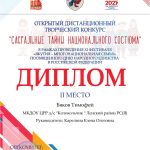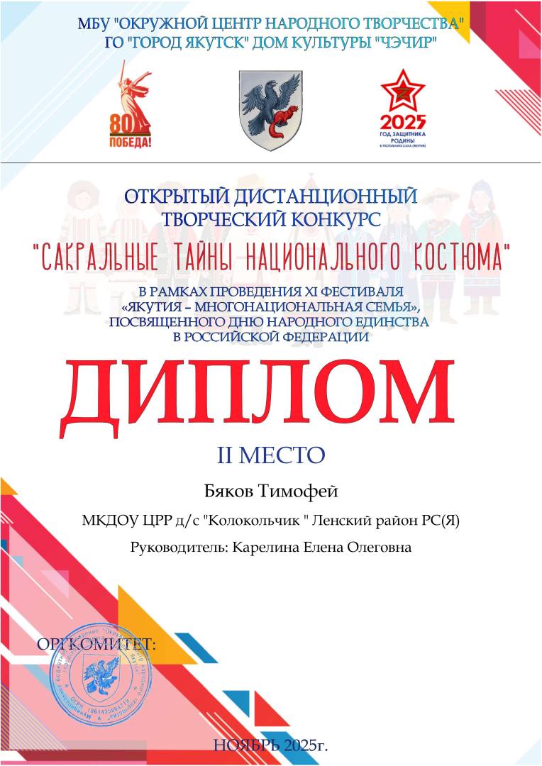 Диплом 2 место Бяков Тимофей за участие в открытом дистанционным творческом конкурсе «Сакральные тайны национального костюма» в рамках проведения XI фестиваля «Якутия-многонациональная семья» посвященного Дню народного Единства. Дом культуры «Чэчир» (ноябрь 2025 год)