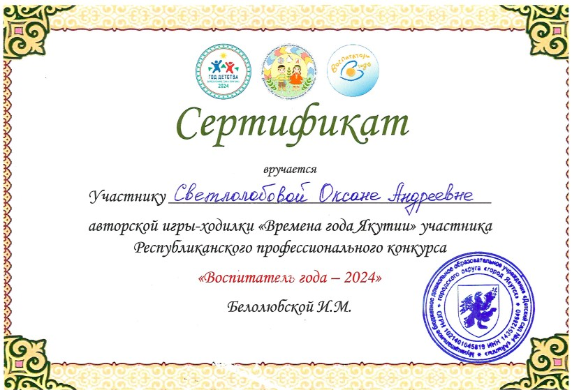 - Сертификат о распространении педагогического опыта Республиканского научно-творческого конкурса посвящённому дню образования Республики Саха (Якутия) «МОЯ И100РИЯ – ЯКУТИЯ», конспект интегрированной образовательной деятельности в средней группе «Мир вокруг нас: необыкновенные места Якутии», май 2024 год.