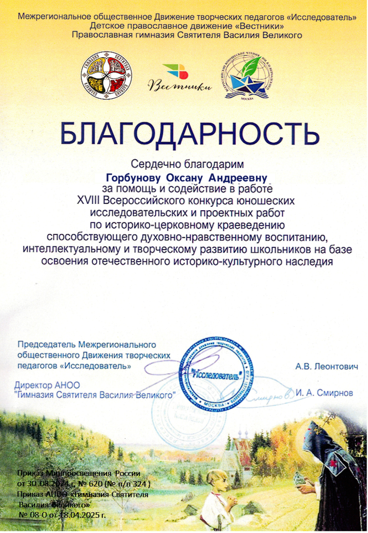 - Благодарность за помощь и содействие в работе XVIII Всероссийского конкурса юношеских исследовательских и проектных работ по историко-церковному краеведению способствующего духовно-нравственному воспитанию, интеллектуальному и творческому развитию школьников на базе освоения отечественного историко-культурного наследия