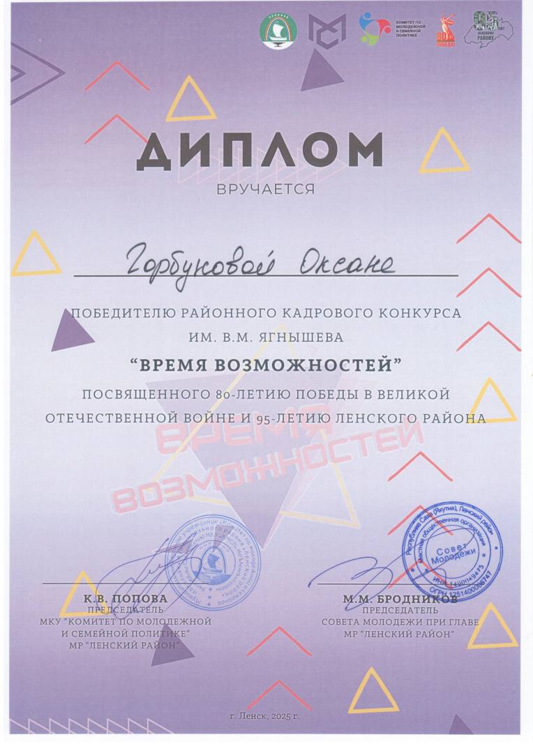 - Сертификат о распространении педагогического опыта на районных педагогических чтениях «Проблемы и перспективы развития системы качества образования», Муниципальное казенное учреждение «Районное управление образования» муниципального района «Ленский район», март 2025