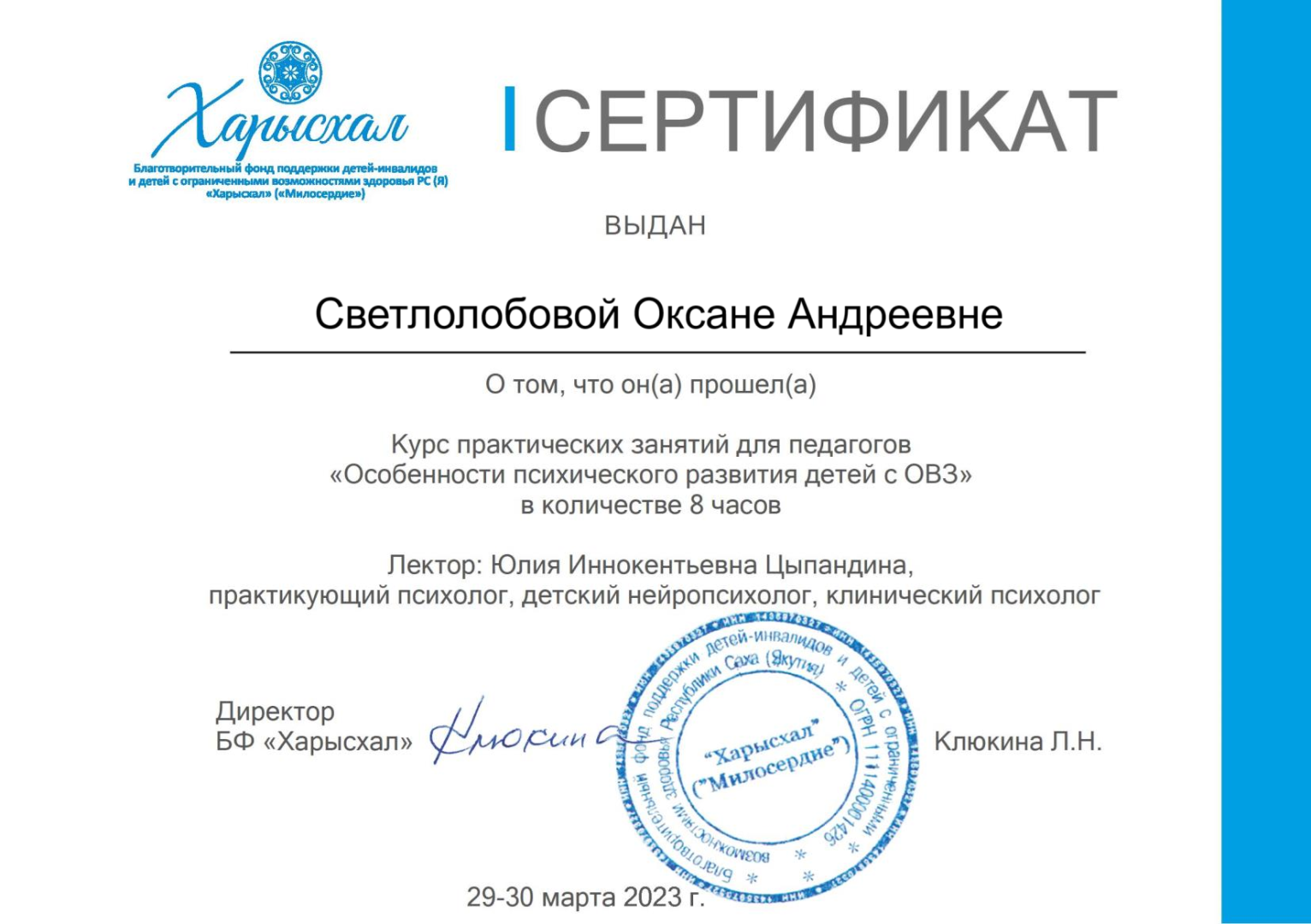 - Сертификат о распространении опыта работы №4998 РЭИИ «ПЕДАГОГИ ЯКУТИИ», методический материал – Конспект интегрированной НОД в подготовительной к школе группе компенсирующей направленности для детей с ТНР «Моя Родина – Россия», 23.12.2022