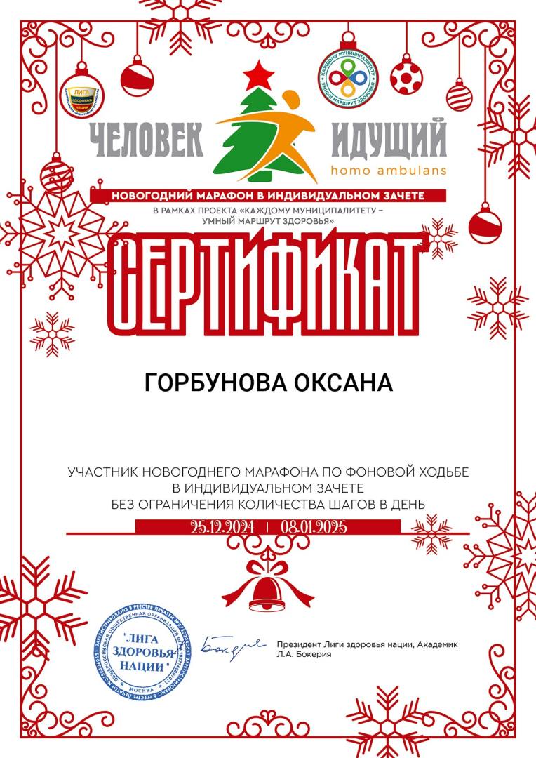 - Сертификат участника новогоднего марафона по фоновой ходьбе в индивидуальном зачёте в рамках проекта «Каждому муниципалитету – умный маршрут здоровья», «Человек идущий», 25.12.2024-08.01.2025