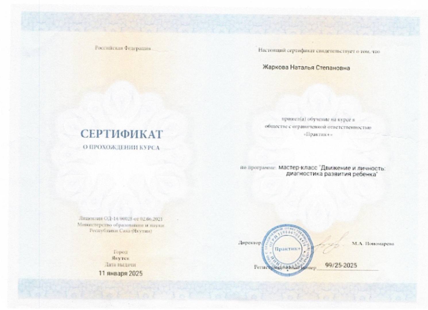 - 2025г., ООО «Практик+», г. Якутск Повышение квалификации по программе Мастер-класс «Движение и личность: диагностирование развития ребёнка» (сертификат №99/25-2025 от 11.01.2025)