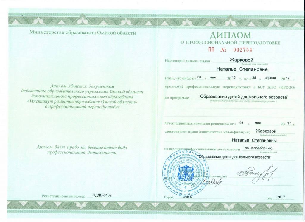 - Диплом о профессиональной переподготовке по программе «Образование детей дошкольного возраста» ДОУ Омской области ДПО «Институт развития образования Омской области и профессиональной переподготовке»