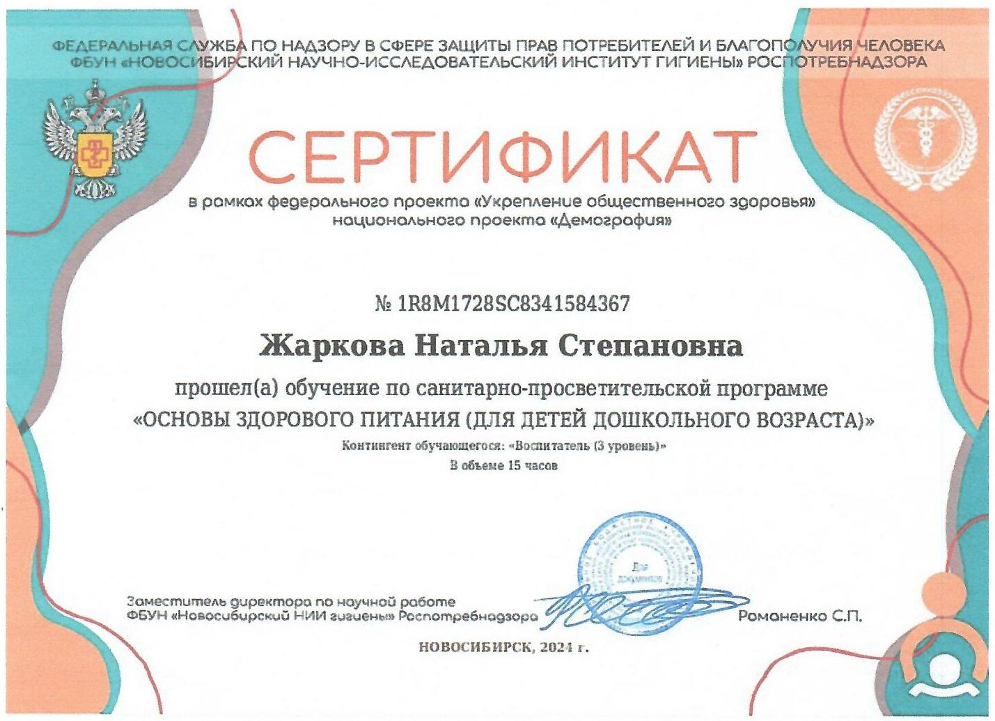 - 2024г., 15 часов ФБУН «Новосибирский НИИ гигиены Роспотребнадзора» обучение по программе «Основы здорового питания (для детей дошкольного возраста) (сертификат №1R8M1728SC8341584367)