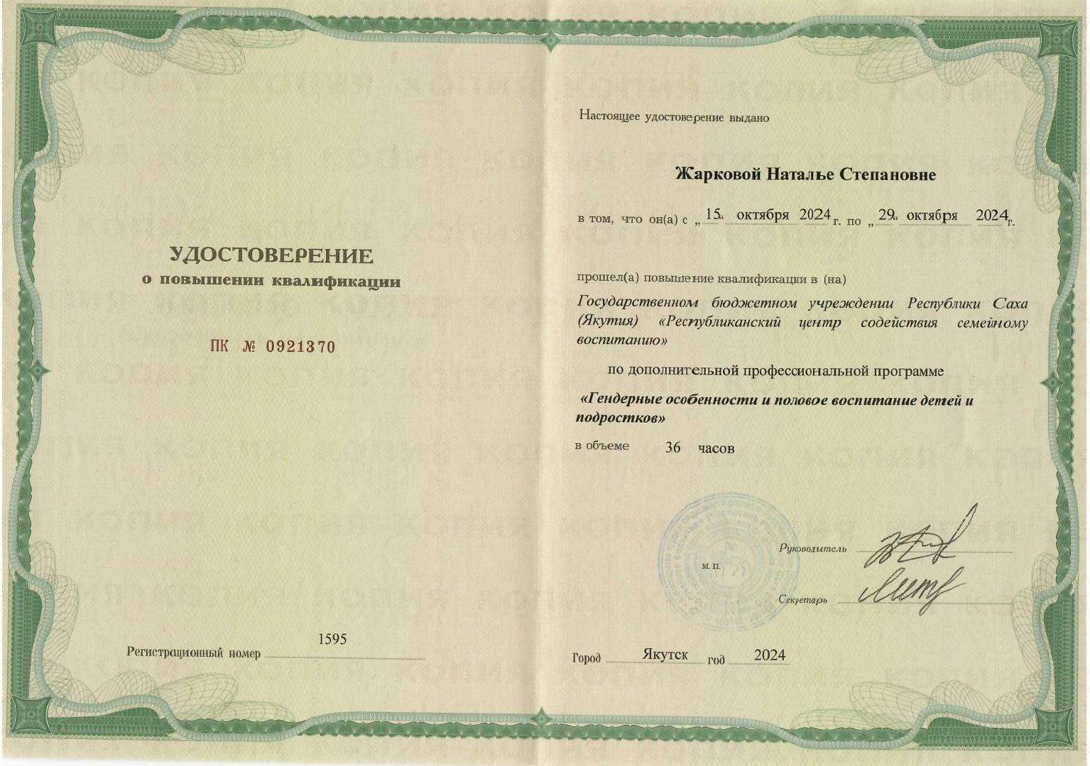 - 2024г., 36 часов ГБУ РС (Я) «Республиканский центр содействия семейному воспитанию» повышение квалификации по программе «Гендерные особенности и половое воспитание детей и подростков» ( удостоверение №0921370)