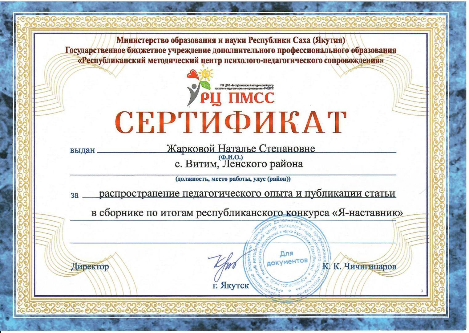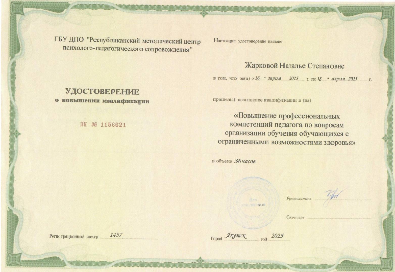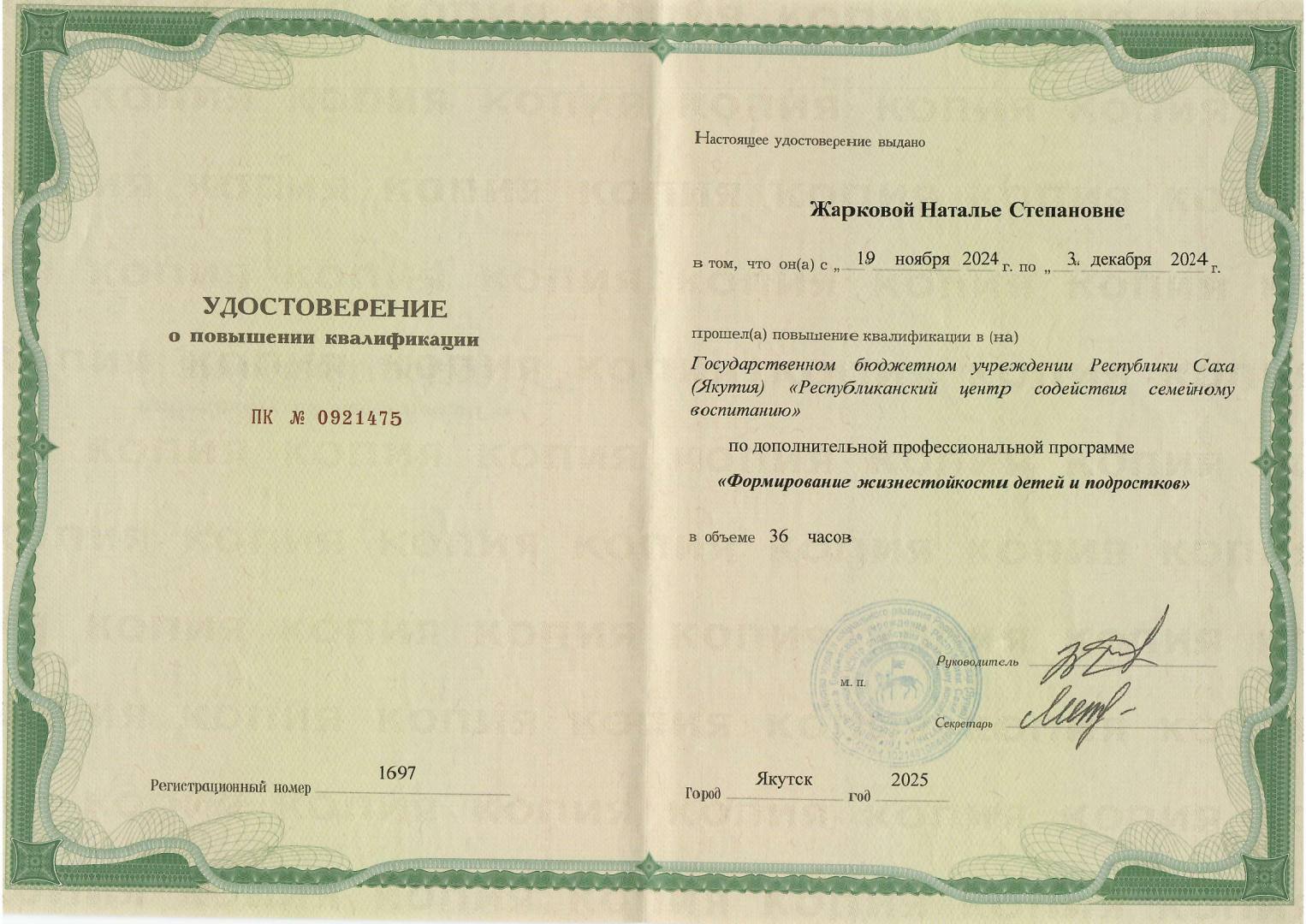 - 2025г., 36 часов Государственное бюджетное учреждение Республики Саха (Якутия) «Республиканский центр содействия семейному воспитанию». Повышение квалификации по программе «Формирование жизнестойкости детей и подростков» (сертификат №09214754)