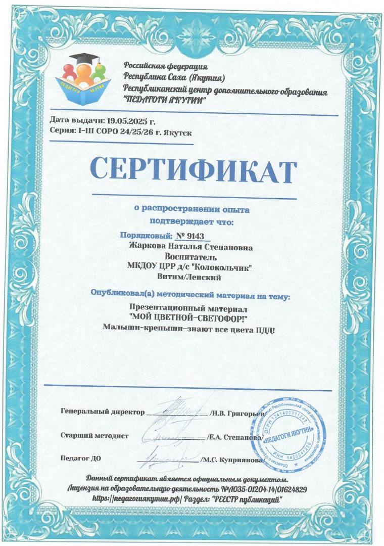 2025., Сертификат о распространении педагогического опыта материал «Мой цветной светофор!» Малыши-крепыши — знают все цвета ДПП!» Республиканский центр дополнительного образования «Педагоги Якутии»