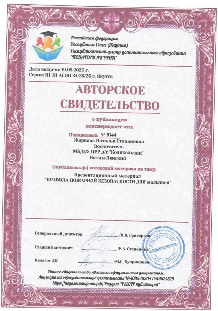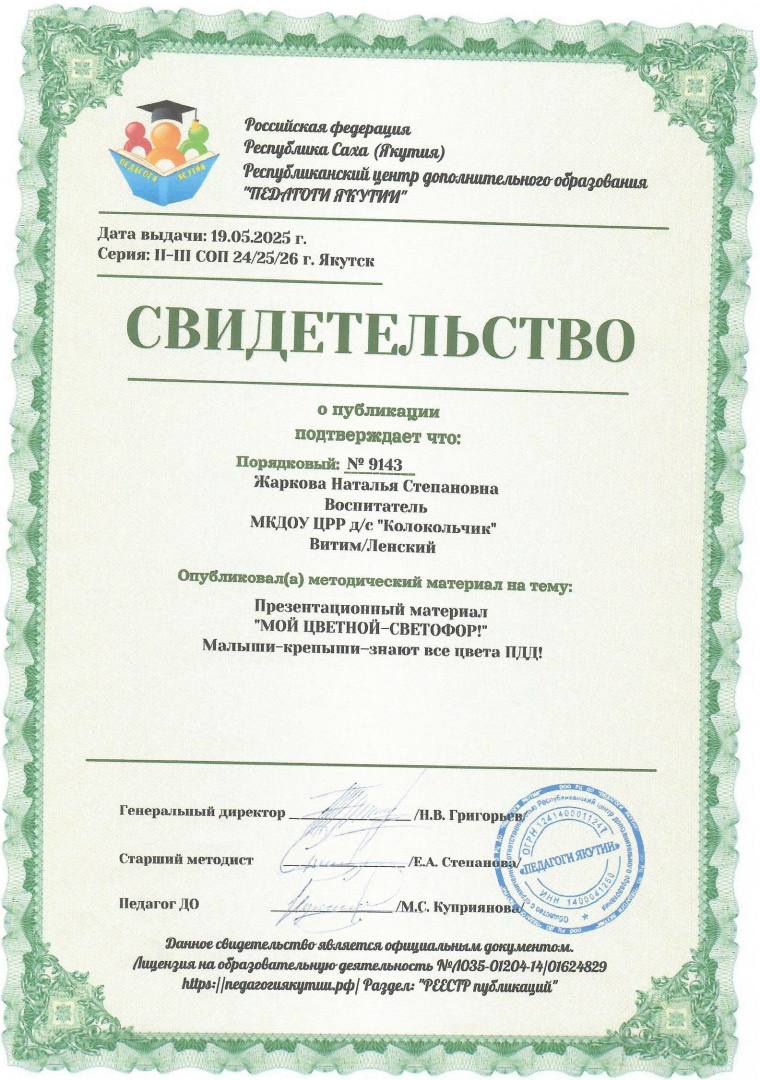 - Свидетельство о публикации №5988. Презентация «Один день из жизни воспитателя». Серия V-CП/2023, г. Якутск