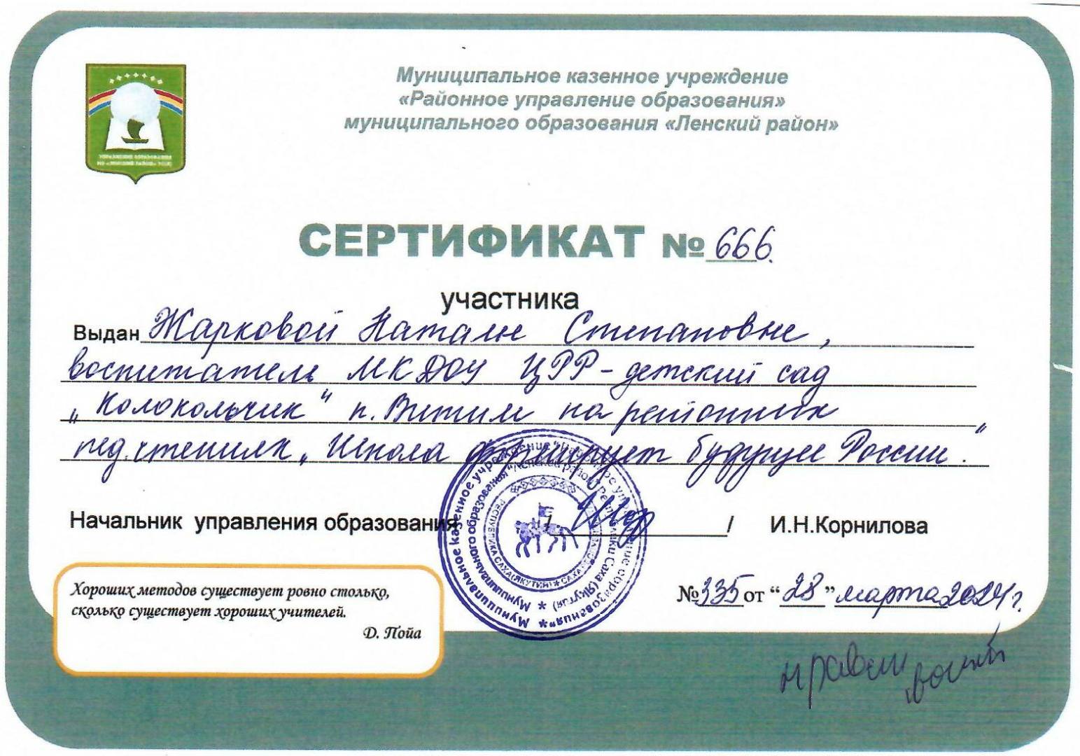 - Сертификат № 666, Районный пед. Чтение «Школа формирует будущее России»